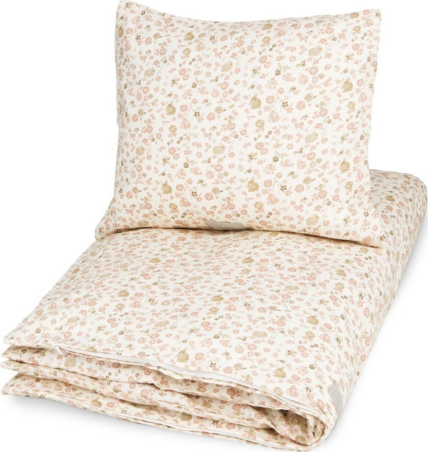 Dětské povlečení Augusta od značky Cam Cam Copenhagen je vyrobeno z měkké organické bavlny v saténové vazbě a pyšní se certifikací GOTS. Jeho povrch zdobí něžný vzor drobných květin a roztomilých zajíčků.