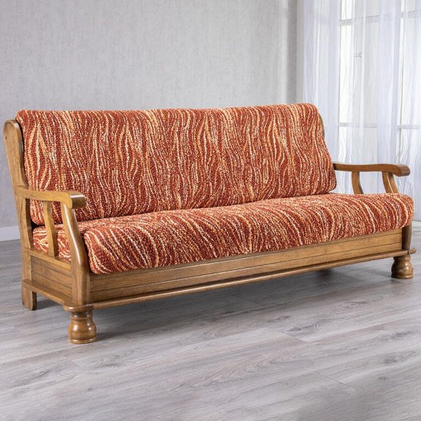 Bielastické potahy UNIVERSO NOVÉ žíhané cihlové trojkřeslo s dřevěnými rukojeťmi (š. 150 – 200 cm)
