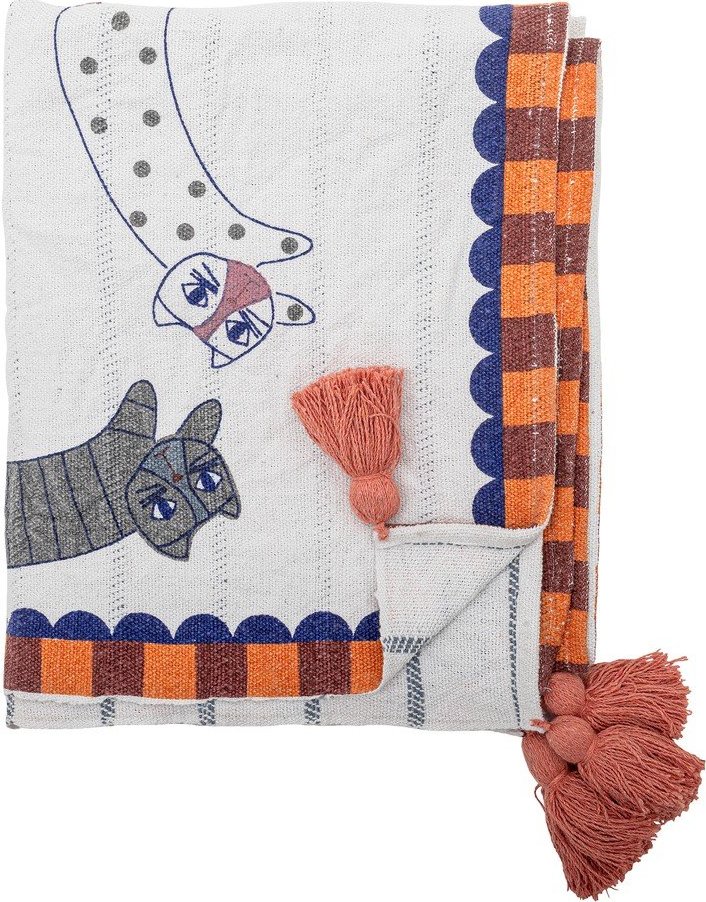 Deka Missy od značky Bloomingville je vyrobena s příměsí bavlny. Zdobí ji potisk koček na jedné straně, zatímco druhá strana nabízí tkané pruhy.