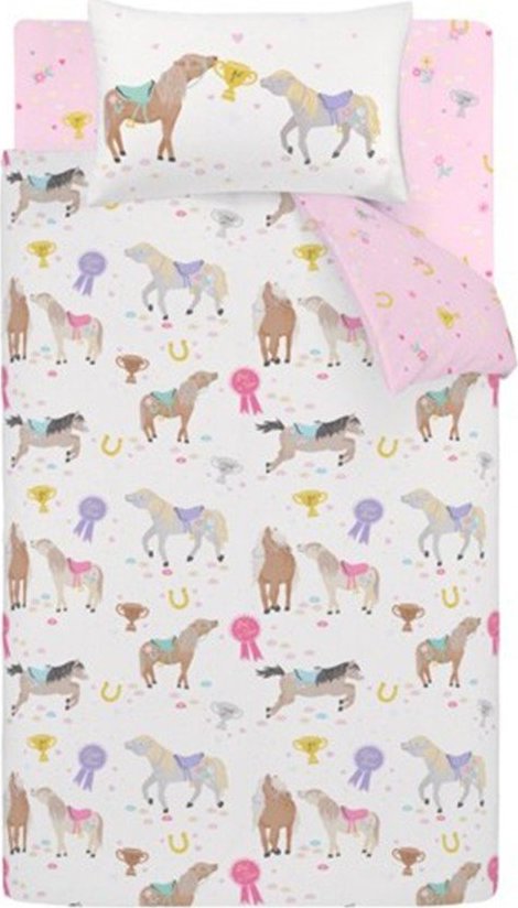 Povlečení Happy Horses od značky Catherine Lansfield je jako stvořené pro sladké sny malých milovníků koní. Zdobí ho hravý potisk s krásně ilustrovanými poníky, rozetami, trofejemi a podkovami, které promění každý pokoj v malé závodiště.